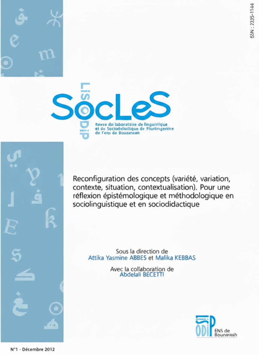 Vol. 1 No 1 (2012)L'objet du présent numéro de la revue Socles fait suite aux travaux des journées d‘étude organisées par le LISODIP (Mai 2012). Notre préoccupation était de soumettre à la discussion quelques points de réflexion sur la façon dont les chercheurs, notamment dans les domaines de la sociolinguistique et de la didactique des langues et des cultures, problématisent — en vue de les re-configurer — des concepts fondamentaux tels que variété, variation, contexte, etc. Le point de départ de cette réflexion est de permettre aux chercheurs de confronter leurs points de vue, de faire part de leurs travaux et cela, dans une dialogique complexe, réflexive, herméneutique éminemment altéritaire. L‘interrogation principale qui guide le parcours de ce numéro est de s‘interroger sur la portée interprétative et heuristique des concepts tels que variété linguistique, variation, contexte, situation, contextualisation.